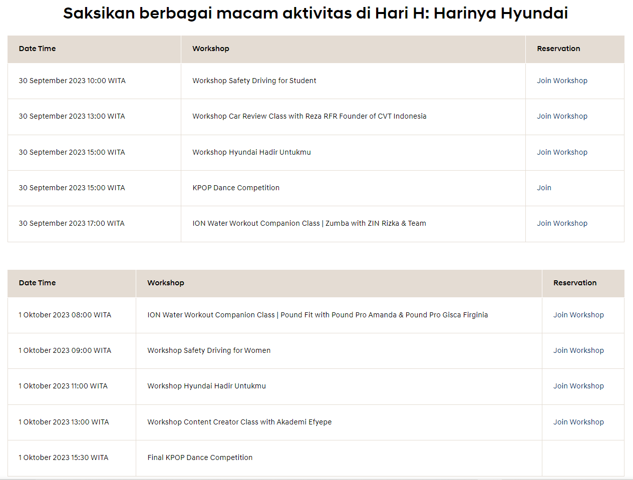 Hari H: Harinya Hyundai akan diselenggarakan pertama kali di Makassar (30 September s/d 1 Oktober 2023), dan akan hadir juga di Medan (7-8 Oktober 2023) serta Jakarta (14-15 Oktober 2023).